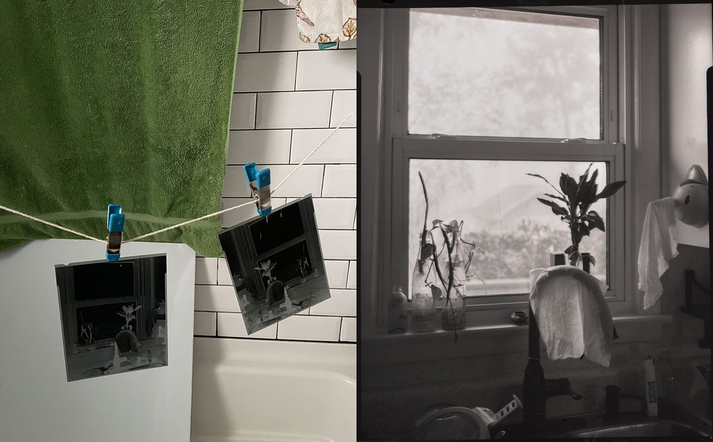 Minutiae: I’ve been working with in-camera exposures on fiber-based paper. While my exposure times are no longer double digits, “B” is still the default shutter speed mode, though it now stands for “Behold,” as in, “Behold, I’m experimenting with fast film.” I guesstimated the developing times and repeated a 1-minute song from Green Day as my official timer, counting off the seconds roughly while often getting lost during the pause in agitation. I’m still perfecting this system, but I’m also embracing it for now. Which is all to say that my home/studio/darkroom is jury-rigged to the hilt.